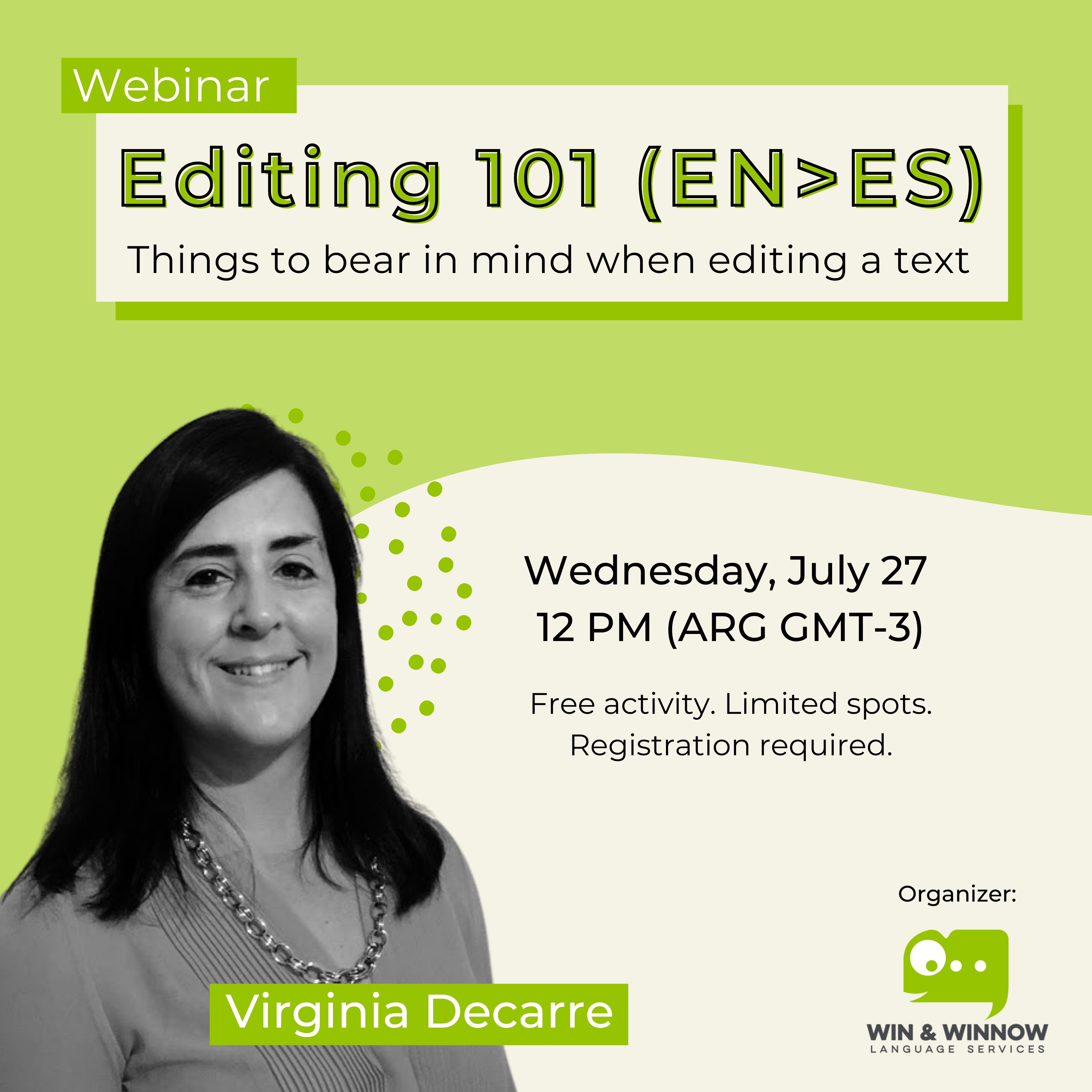 In this edition of Winnow Academy, Virginia Decarre, Senior Language Lead at Win & Winnow Language Services, shares the answers to questions like What is editing? What is the role of a translation editor? What is the difference between editing and proofreading? Why is editing important in translation? What should I take into account when editing into Spanish?